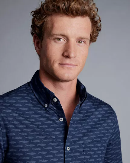 Break out of your usual outfit mould with this statement fish print. A rich and timeless navy shade keeps the bold design down-to-earth and is sure to be a conversation starter. Why not style it with pair of chino shorts for summer parties?