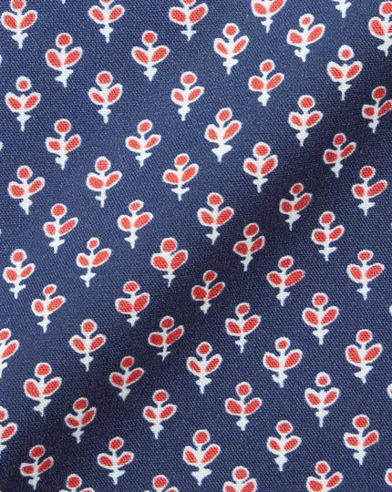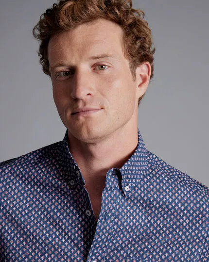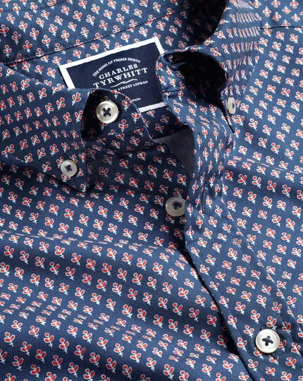 Our distinctive leaf print brings a dash of botanical character to this style. Finely drawn sprigs in shades of blue and coral are scattered against the royal blue background, giving you plenty of color-matching choices. A button-down collar adds to the laid-back feel.