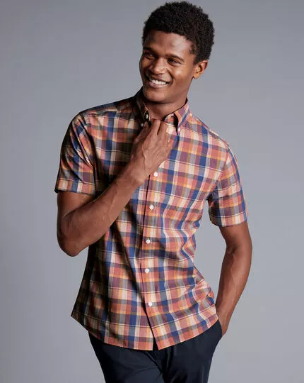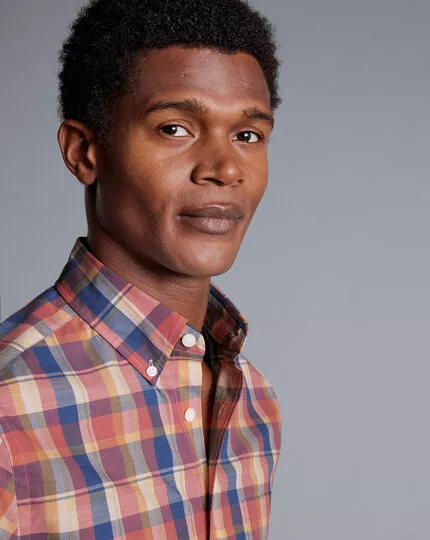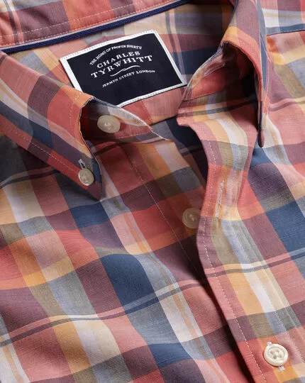This non-iron stretch poplin shirt is crafted from our specially woven slub yarn, giving a linen-like look from 100% cotton. You get the subtle texture and rustic tonal variations that exude a laid-back, summery feel.Natural stretch ensures comfort and freedom to move, and our garment washing gives this shirt a sublimely soft finish. Choose from three new, Madras-inspired checks for a colorful addition to your summer suiting selection.