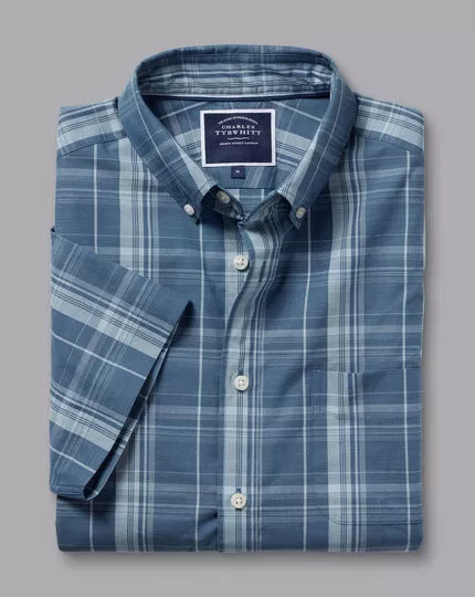 CHARLES TYRWHITT Button-Down Collar Non-Iron Stretch Poplin Slub Multi Check Short Sleeve Shirt – Steel B