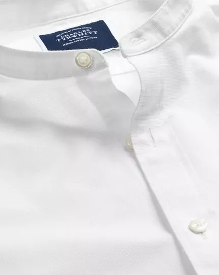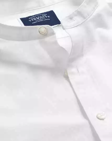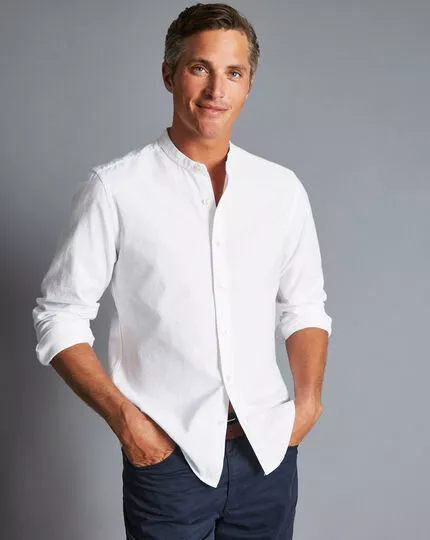 Collarless shirts are synonymous with laid-back style. Its oxford weave enhances breathability further and delivers a silky-soft feel on skin. This design in a classic white shade is a contemporary and more relaxed alternative to a traditional button-down shirt. Ideal for smart-casual dressing, this slim-fit shirt looks elegant worn under a lightweight blazer.