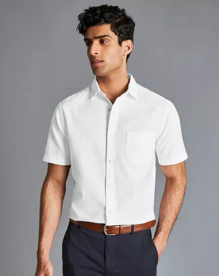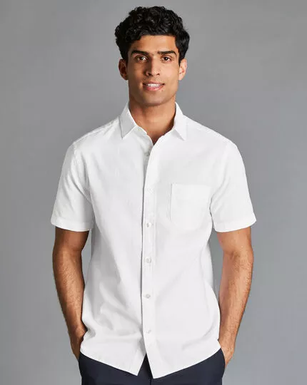 This short-sleeved Oxford shirt is a smart-casual staple that takes you from work to weekend. It’s crafted in a mid-weight blend of cotton and linen that wicks away moisture – plus, we’ve garment washed it for extra softness. The added split back yoke means you can move freely, whatever your day has in store. In crisp white, the shirt has endless versatility. Its fresh look and airy feel means you’ll be as comfortable wearing it with chino shorts for weekend barbecues as you will be tucking it into smart pants for work.
