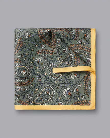 CHARLES TYRWHITT Floral Paisley Silk Pocket Square – Sage Green & Yellow