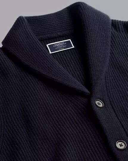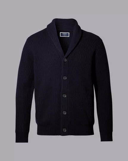 This classic navy shade will complement all of your wardrobe essentials. Modern styling touches include a shawl collar, tonal buttons on the front, and welt pockets at the side. Wear this cardigan over a button-down shirt for a refined take on casual dressing.