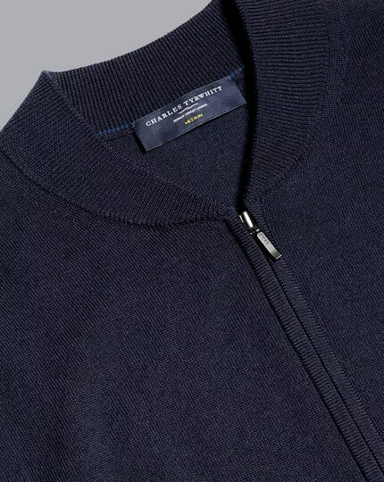This zip-up bomber jacket is knitted from 100% extra fine merino wool in a jersey stitch, with a rounded baseball collar neckline and two pockets. The zip at the front is concealed for a streamlined look, and rib detailing on the collar, hem, and cuffs create a classic bomber shape. The merino fibers make it lightweight and soft, yet offer good insulation in cold weather, and the piece has been garment-washed for extra softness.
