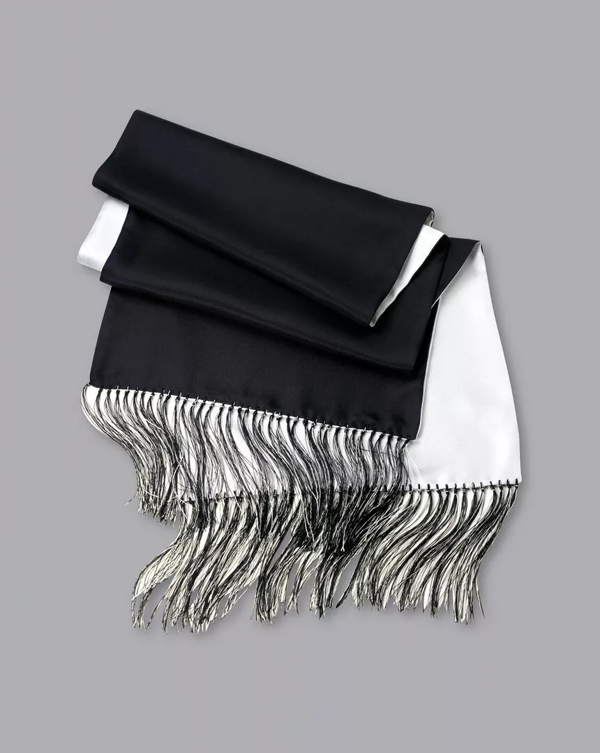 This light silk scarf, measuring 155cm by 33cm, is reversible: one side is black, and the other is white. Wear to add a finishing flourish to a black tie ensemble, or give it as a luxurious gift.