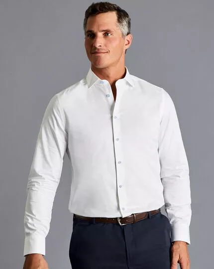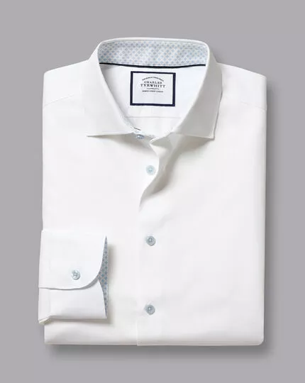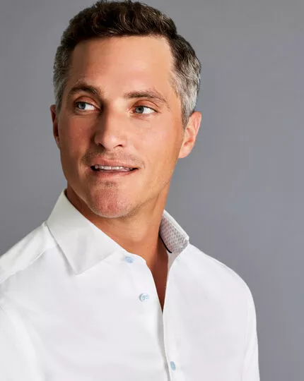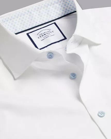 Spun from versatile mid-weight fabric, this cotton twill shirt with printed trims deserves to be a permanent fixture in your wardrobe. Take a look inside the collar and cuffs – you’ll find a stylish hidden pattern adding that extra touch of Tyrwhitt personality. Contrasting buttons bring a dash of color that stands out against the shirt’s clean white shade. On dressed-up days, the subtle texture makes this piece the perfect backdrop to your favorite tie.