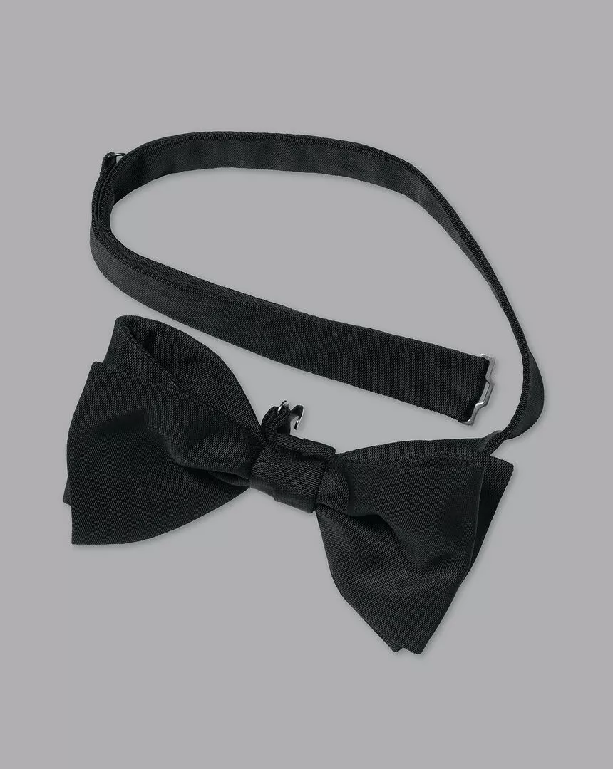 This black bow tie, a vital eveningwear accessory, is made from pure silk barrathea – smooth with a shiny lustre for an elegant look. It comes ready-tied for minimal fuss, with an adjustable neck band, and is hand-finished, displaying fine craftsmanship. Perfect for black tie and formal occasions.
