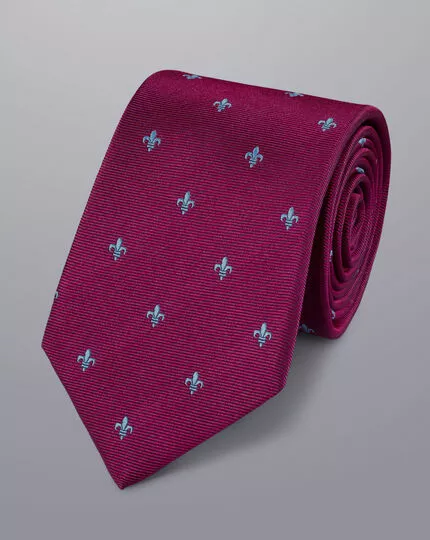 This fleur-de-lys tie is a winner for both style and practicality – the pure silk drapes elegantly and has a stain-resistant finish. This innovative design ensures any spills run off and helps to maintain the lustrous appearance of the supple fabric. The heraldic pattern and twill weave lend this piece a traditional feel. A keeper loop holds the tail end neatly in place, while the secret recovery loop means the fabric can be pulled back into shape after wear. The classic width makes this tie a versatile choice to pair with business or formal attire.