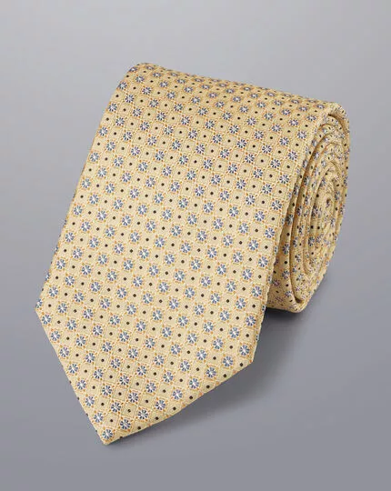 No need to pack a spare. This patterned tie has a stain-resistant finish that lets liquid simply run off the silk.