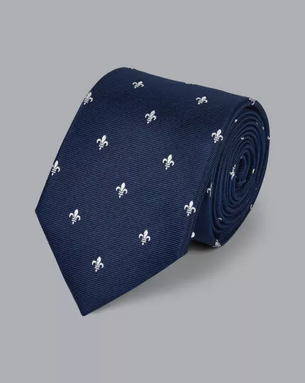 This fleur-de-lys tie is a winner for both style and practicality – the pure silk drapes elegantly and has a stain-resistant finish. This innovative design ensures any spills run off and helps to maintain the lustrous appearance of the supple fabric. The heraldic pattern and twill weave lend this piece a traditional feel. A keeper loop holds the tail end neatly in place, while the secret recovery loop means the fabric can be pulled back into shape after wear. The classic width makes this tie a versatile choice to pair with business or dress attire.