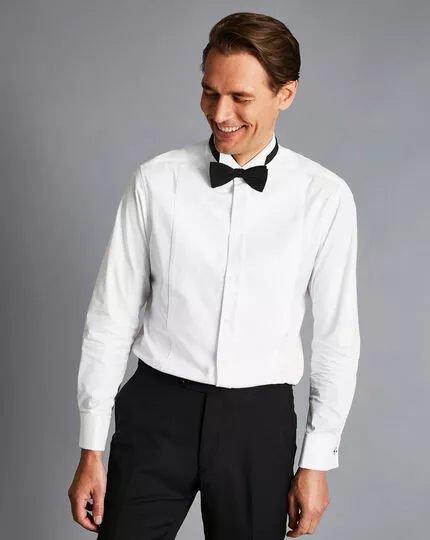 The body fabric is crafted from Egyptian cotton for a luxurious, smooth feel, in a poplin weave and with a split back yoke to allow for movement. It also has traditional evening shirt features, including a bib front in a customary Marcella weave and extra button holes for replacing the buttons with studs.