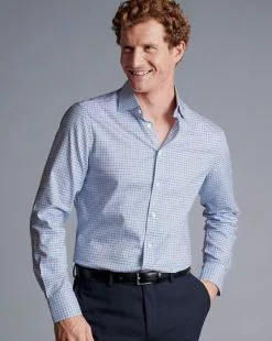 CHARLES TYRWHITT Semi-Spread Collar Egyptian Cotton Twill Small Grid Check Shirt – Ocean B