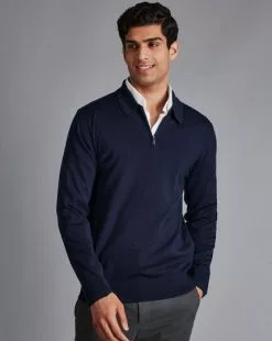 CHARLES TYRWHITT Merino Zip Neck Polo Sweater – Navy