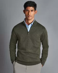 CHARLES TYRWHITT Merino Zip Neck Sweater – Olive Green Melang